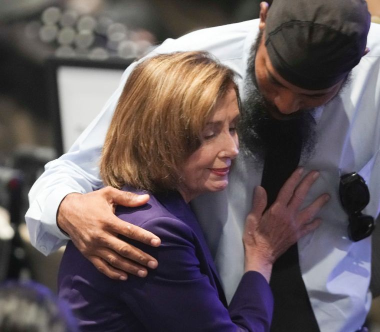 HOUSTON, TEXAS – AUGUST 1: Democratic Speaker Emerita Nancy Pelosi receives a hug during the Celebration of Life Service for Sheila Jackson Lee at Fallbrook Church on Thursday, Aug. 1, 2024, in Houston. Jackson Lee died July 19 after being treated for pancreatic cancer. (Elizabeth Conley/Houston Chronicle via Getty Images) color image,photography,horizontal,usa,sport,texas,houston – texas,funeral,gulf coast states,human interest,embracing,sheila jackson-lee,obituary,nancy pelosi,sports official