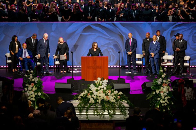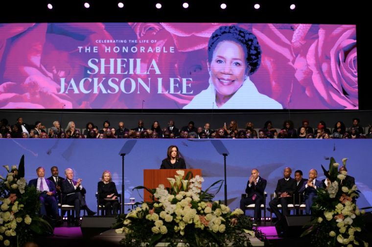 HOUSTON, TEXAS – AUGUST 01: U.S. Vice President Kamala Harris gives the eulogy during Congresswoman Sheila Jackson Lee’s during funeral service at the Fallbrook Church on August 01, 2024 in Houston, Texas. Members of the community and elected officials gathered to honor the life of the late U.S. Rep. Sheila Jackson Lee. Vice President Kamala Harris among other elected officials were in attendance for the funeral, where she will delivered remarks and the eulogy. (Photo by Brandon Bell/Getty Images)