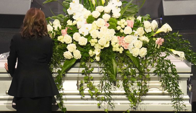 HOUSTON, TEXAS – AUGUST 01: The casket of Congresswoman Sheila Jackson Lee sits in her funeral service at the Fallbrook Church on August 01, 2024 in Houston, Texas. Members of the community and elected officials gathered to honor the life of the late U.S. Rep. Sheila Jackson Lee. Vice President Kamala Harris among other elected officials are expected to be in attendance for the funeral, where she will deliver remarks and the eulogy. (Photo by Brandon Bell/Getty Images) color image,photography,horizontal,usa,texas,houston – texas,politics,funeral,gulf coast states,coffin,sheila jackson-lee,politics and government,member of congress
