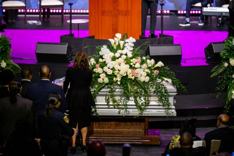 HOUSTON, TEXAS – AUGUST 01: U.S. Vice President Kamala Harris pays her respects to the family of Congresswoman Sheila Jackson Lee after giving the eulogy during the funeral service at the Fallbrook Church on August 01, 2024 in Houston, Texas. Members of the community and elected officials gathered to honor the life of the late U.S. Rep. Sheila Jackson Lee. Vice President Kamala Harris among other elected officials were in attendance for the funeral, where she will delivered remarks and the eulogy. (Photo by Brandon Bell/Getty Images) color image,photography,horizontal,usa,texas,houston – texas,politics,vice president,funeral,gulf coast states,sheila jackson-lee,politics and government,kamala harris,eulogy,member of congress