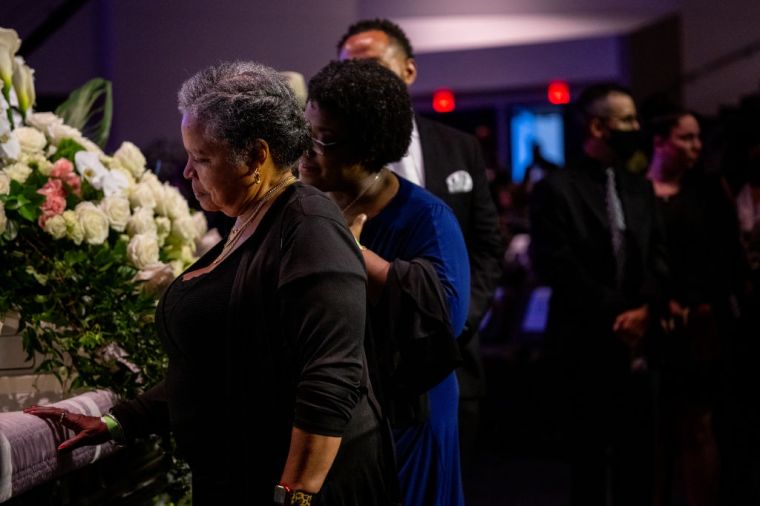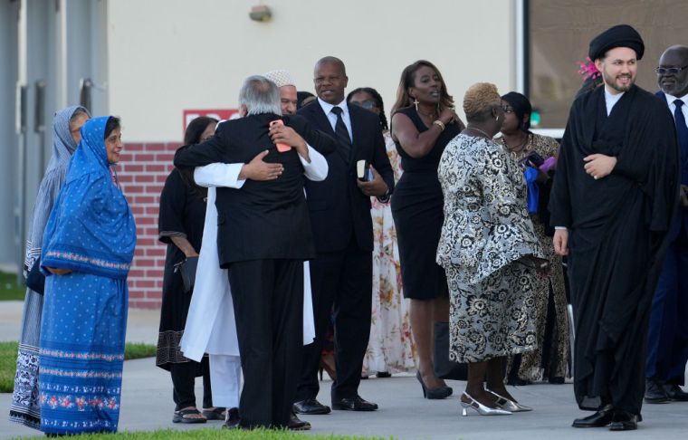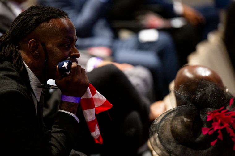 HOUSTON, TEXAS – AUGUST 01: People mourn the death of Congresswoman Sheila Jackson Lee during her funeral service at the Fallbrook Church on August 01, 2024 in Houston, Texas. Members of the community and elected officials gathered to honor the life of the late U.S. Rep. Sheila Jackson Lee. Vice President Kamala Harris among other elected officials are expected to be in attendance for the funeral, where she will deliver remarks and the eulogy. (Photo by Brandon Bell/Getty Images) color image,photography,people,horizontal,usa,three people,death,texas,houston – texas,politics,funeral,gulf coast states,sheila jackson-lee,politics and government,member of congress