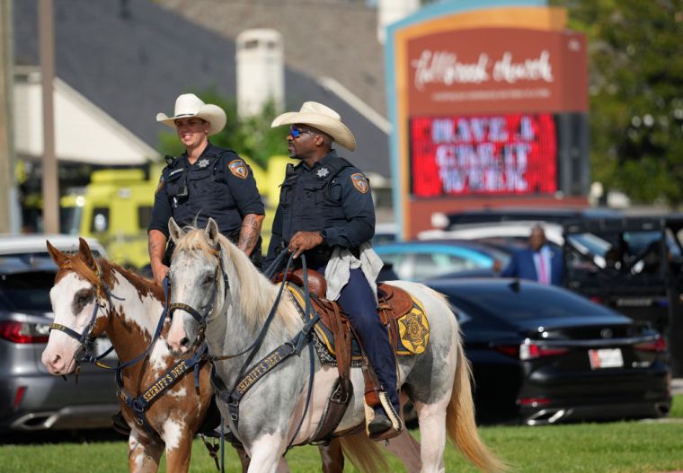 HOUSTON, TEXAS – AUGUST 1: Harris County Sheriffs Office mounted patrol deputies are shown at Fallbrook Church, 12512 Walters Rd., during the funeral of Congresswoman Sheila Jackson Lee Thursday, Aug. 1, 2024, in Houston. (Melissa Phillip/Houston Chronicle via Getty Images) color image,photography,horizontal,usa,sport,office,texas,houston – texas,funeral,gulf coast states,human interest,police force,harris county,sheila jackson-lee,obituary,sheriff,sports official,member of congress