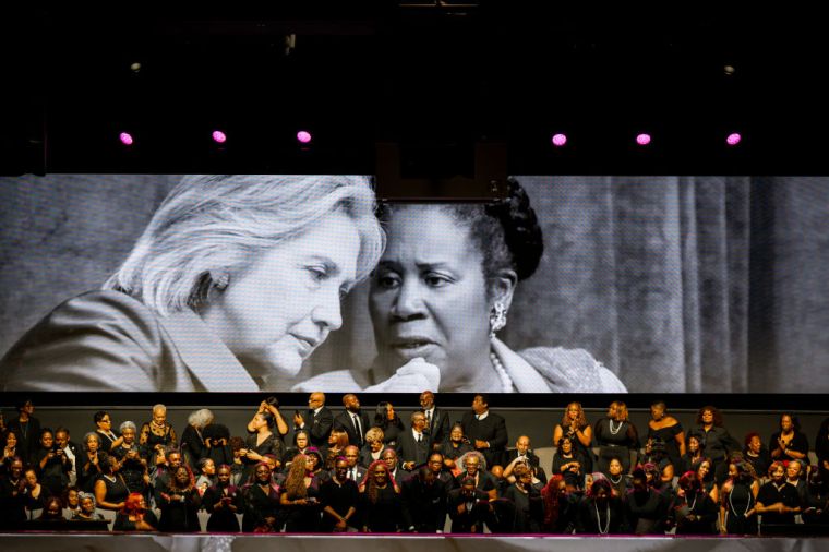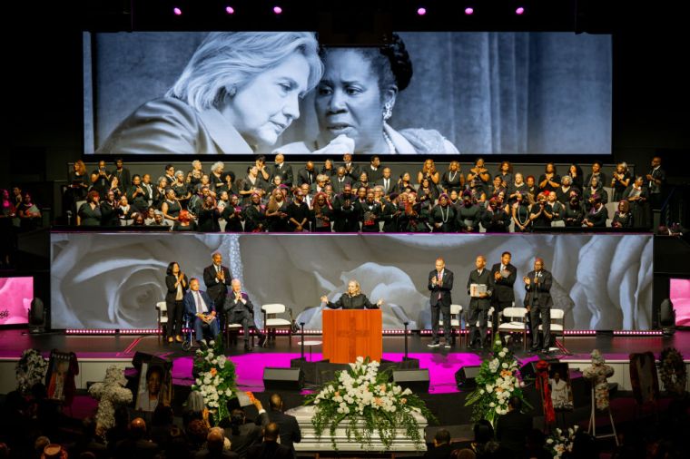 HOUSTON, TEXAS – AUGUST 01: Former President Bill Clinton, Secretary Hilary Clinton, and Rev. Jesse Jackson stand among elected officials while honoring Congresswoman Sheila Jackson Lee during her funeral service at the Fallbrook Church on August 01, 2024 in Houston, Texas. Members of the community and elected officials gathered to honor the life of the late U.S. Rep. Sheila Jackson Lee. Vice President Kamala Harris among other elected officials are expected to be in attendance for the funeral, where she will deliver remarks and the eulogy. (Photo by Brandon Bell/Getty Images) color image,photography,horizontal,usa,texas,houston – texas,politics,funeral,gulf coast states,politician,bill clinton,hillary clinton,jesse jackson sr.,sheila jackson-lee,politics and government,member of congress