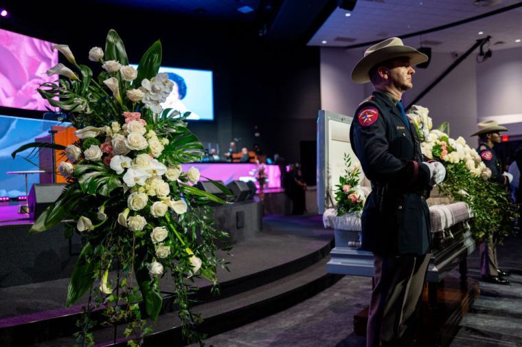 HOUSTON, TEXAS – AUGUST 01: Texas Highway Patrol stand watch over the casket of Congresswoman Sheila Jackson Lee during her funeral service at the Fallbrook Church on August 01, 2024 in Houston, Texas. Members of the community and elected officials gathered to honor the life of the late U.S. Rep. Sheila Jackson Lee. Vice President Kamala Harris among other elected officials are expected to be in attendance for the funeral, where she will deliver remarks and the eulogy. (Photo by Brandon Bell/Getty Images) color image,photography,people,horizontal,usa,two people,texas,houston – texas,politics,funeral,gulf coast states,protection,coffin,sheila jackson-lee,politics and government,highway patrol,member of congress