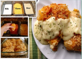 Ingredients Chicken: 4 large chicken breasts 2 sleeves Ritz crackers 1/4 t salt 1/8 t pepper 1/2 C milk 3 C cheddar cheese, grated 1 t dried parsley Sauce: 1 14 ounce can cream of chicken soup 2 T sour cream 2 T butter Click here for directions